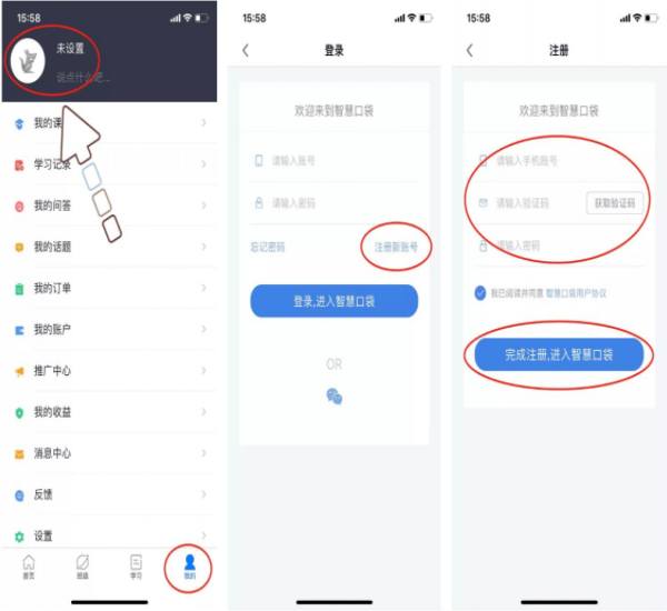 ① 点击APP->【我的】->【头像】->【登录】界面中的“注册新账号”。【图 ③】