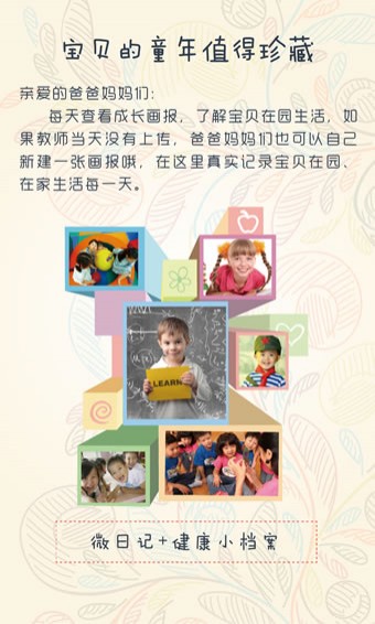 智慧幼儿园家长客户端是江苏黄金屋教育咨询有限公司推出的一款可以方便家长及时了解孩子在幼儿园的情况,通过成长画报了解孩子在园生活的手机应用。