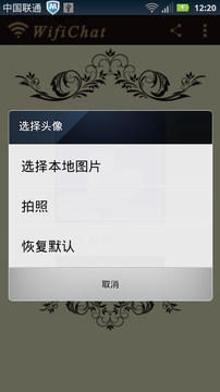 WifiChat是一款局域网聊天应用。1.2版本[修复]没有加载sd卡状态,无法获取头像问题[新增]192.168.0.*网段数据发送1.1版本[优化]增强了信息传送的稳定性[优化]增强了信息收发速度1.0版本:支持Android2.1系统及以上设备。通过此应用,用户可迅速实现局域网内的数据通信。简洁的UI基于Android Design规范,带给用户更便捷的局域网通信体验。注:请保证您的移动设备所在网络中分配的ip网段为192.168.1.*/192.168.0.*。