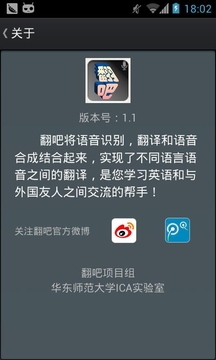 翻吧将语音识别,翻译和语音合成结合起来,实现了不同语言语音之间的翻译,是您学习英语和与外国友人之间交流的帮手!