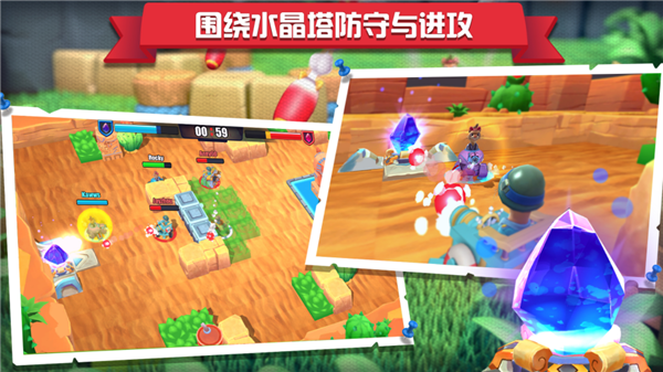 是一款卡通竞技玩法手游,游戏中的玩法和地图每小时进行轮换,并会不断扩展新玩法和新地图;游戏中已有的玩法包括“保卫水晶塔”、“炸裂球大赛”和“夺宝大作战”等。