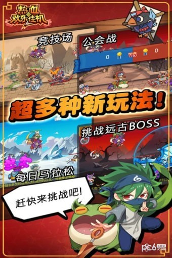 《热血欢乐挂机》为日系可爱画风,角色来自世界各国知名传奇妖怪或兽族,例如:孙悟空、唐三藏、安倍晴明、辉夜姬、酒吞童子、弗兰肯、狼人、剑圣等等,妖怪觉醒后还会改变造型,游戏中还有图鉴系统,超Q的妖怪等你来收集!