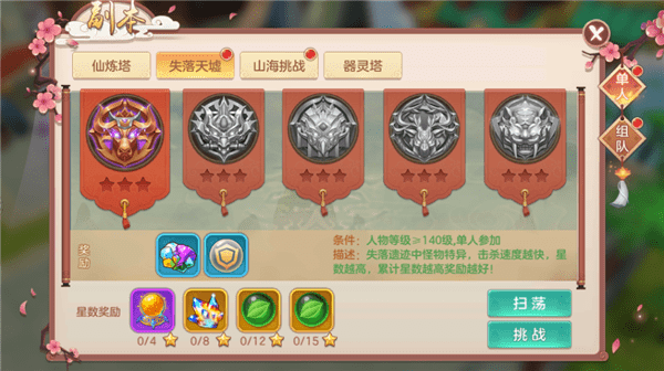 副本(失落天墟、山海挑战、器灵塔)新增扫荡功能,减少玩家副本的时间。