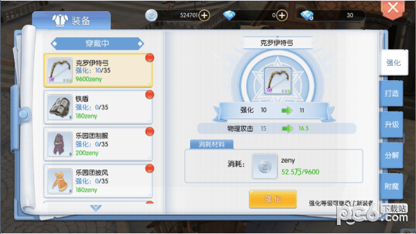 装备强化功能开启后在装备页面或者在主城NPC出可打开进行炒作。强化功能主要是消耗Z币对各装备部位进行强化,从而获得装备的基础属性的增长。