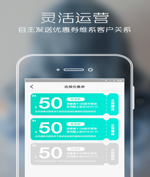 【灵活运营】 自主发送优惠抵值券,紧密维系客户关系。