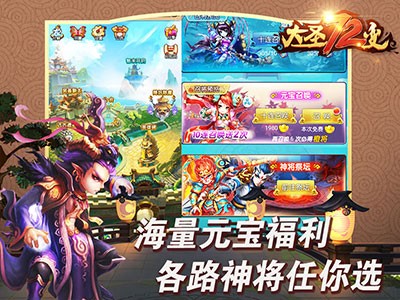 Q版即时战斗变身手游《大圣72变》顶级画质,超炫酷技能特效,完美呈现,上百种西游神将任意搭配,爆笑剧情,颠覆你所认识的西游世界。