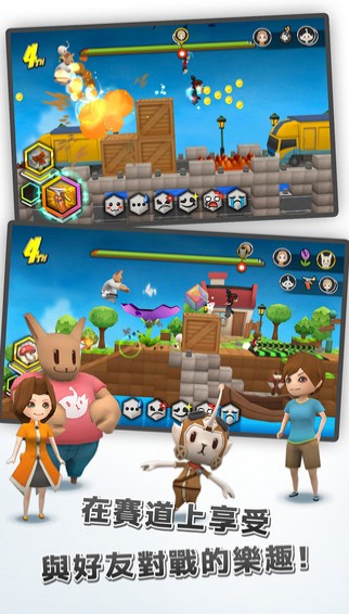 游戏中玩家需要回避陷阱及采集道具箱并使用多达 11 款的道具攻击对手,阻碍他们行动或使用护盾抵挡他们的攻击。游戏目前共有 4 款角色给玩家选择,并内建 100 款以上的时装与装饰物。每个角色均有六项不同素质和各自的技能,角色还能使用游戏币强化,每个角色目前有十个等级可以强化,强化后会提升他们的速度和攻击力等。