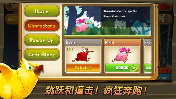 飞不远没关系!咱有跳跃和撞击!那些坏猫偷走了图腾!边吃猕猴桃,边寻找图腾!美丽可爱的几维鸟和营养丰富的猕猴桃利维克、芬克、维克、弗兰克、米克、波克!共6种几维鸟!香甜的猕猴桃,一个都不能少!用跳跃和撞击来狂吃!力量提升,天下无敌用力量提升,越来越轻松!更快!更远!日益更新的任务和奖励稍等,拿完奖励再走!完成每日任务,领取奖励和道具!比比谁更强跟FACEBOOK好友比比,看看谁更厉害!挑战好友,其乐无穷!