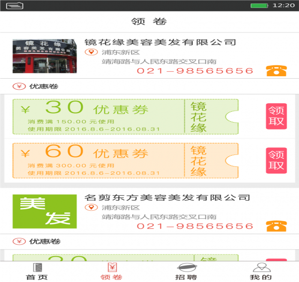 2、【求职招聘】app有专门的招聘模块,提供店铺招聘信息,有意者可致电店铺进行资讯