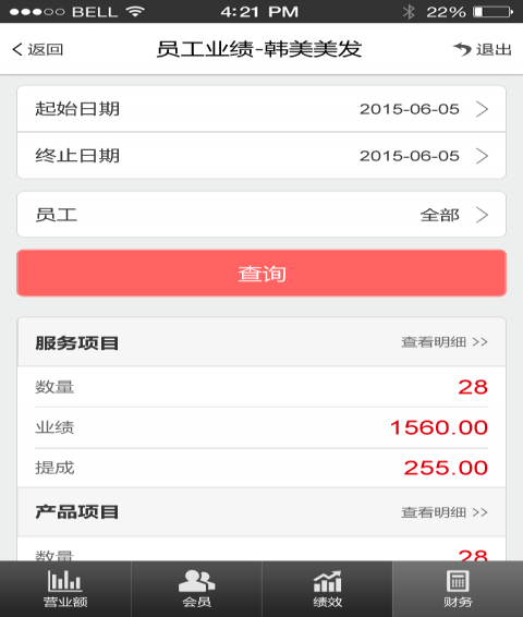 老板可以在手机上随时查询到门店的服务项目、产品销售、会员开卡、续卡的业绩和提成情况。