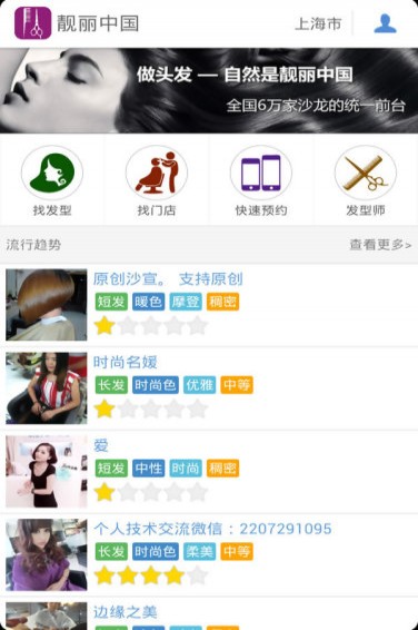 靓丽中国汇集全国60000家美发沙龙的统一服务前台,可查找全国各地的美发店和优秀的发型师,同时可直接手机预约发型师,会员门店手机结账,为消费者提供附近领域美发沙龙商户信息、最流行的发型作品展示,消费点评及优惠等服务。为想做头发的你提供最大的便利。