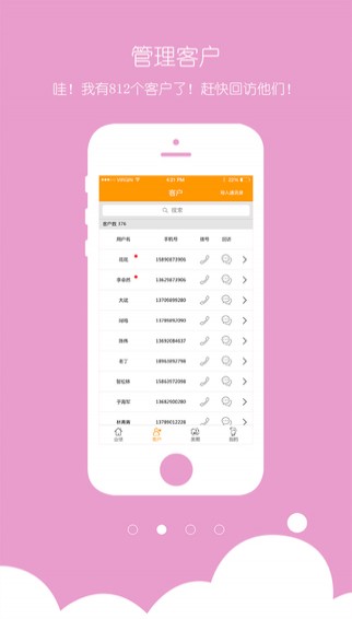管理客户:即时查看自己的客户资料,提醒回访老客户!