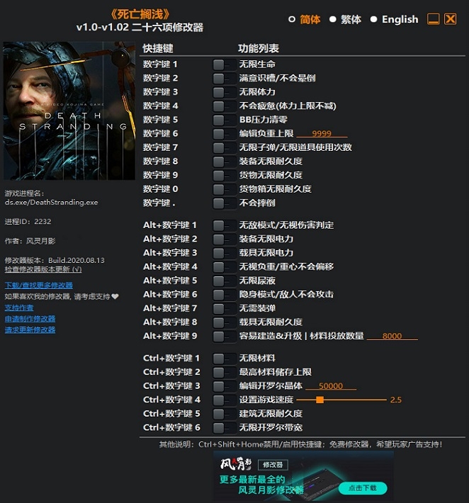 以上就是死亡搁浅二十六项修改器的全部内容了,快快收藏游戏爱好者下载更多软件和游戏吧!