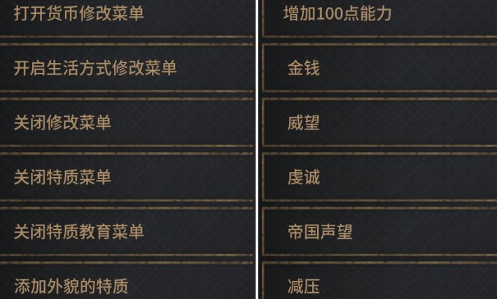 十字军之王3游戏内置修改器需要把文件放在游戏根目录下运行,相当于输入作弊码,自定义地去修改玩家所需内容,在这款游戏中可以修改天才特质、海格力斯特质、生活方式、外貌等等,让游戏玩法更加丰富。