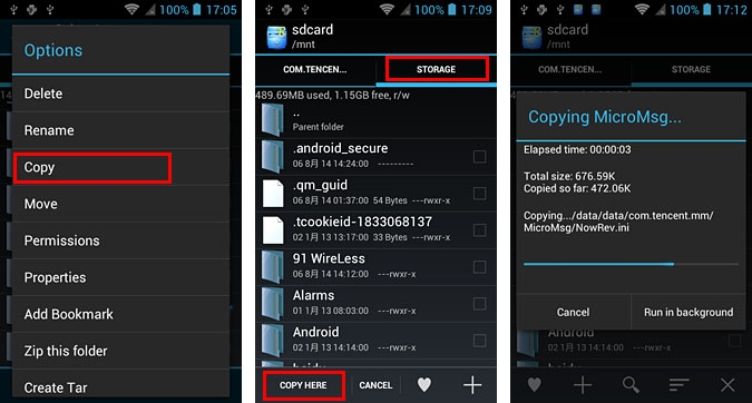 长按“MicroMsg”后会弹出操作选项,选择“Copy”,然后选择“STORAGE”即SD存储卡,然后选择左下角“COPY HERE”,完成后即可将数据文件复制到存储卡上
