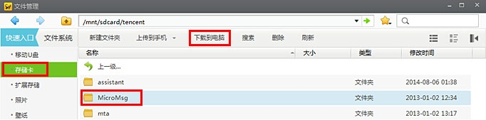 3.在打开的新窗口里选择“存储卡”,在右边找到“tencent”,双击展开目录,找到“MicroMsg”文件夹,然后点击上方的“下载到电脑”,等待传输完毕即可。