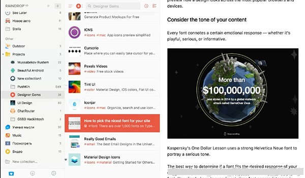 Raindrop.io是一款非常漂亮的网络书签工具,可以从网站和应用程序上截取文章、照片、视频和网页,支持 Web, iPhone, ipad, Android, Mac OS X, Google Chrome, Firefox, Safari, Opera,Raindrop.io不仅支持一些普通的文字或图片型的网站,还可以把视频的类型的网站分类地保存在书签中,用户还可以通过Raindrop.io快速地分享已经保存的书签。
