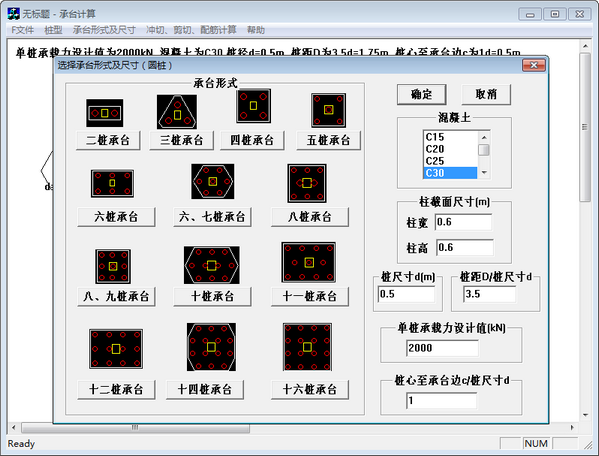 2~16桩承台的冲切、剪切、配筋计算。承台强度计算软件需在Windows9x的支持下运行。屏幕的分辨率最好设置为1024×768或以上,最低要设置为800×600,若设置为640×400,可能有一部分窗口内容被截去。