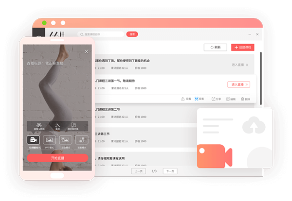 视频直播、PPT直播、画中画模式、手机录屏、电脑录屏、手写课件,高清摄像机,以及录播课上传……