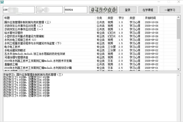 浙江省水利专业技术人员在线学习系统自动学习程序支持用学习系统的账号密码登录,获取目前正在学习的课程列表,可点击一键学习自动进行刷课,用户能够在详情页面查看刷课进程以及完成任务还需要的时间。