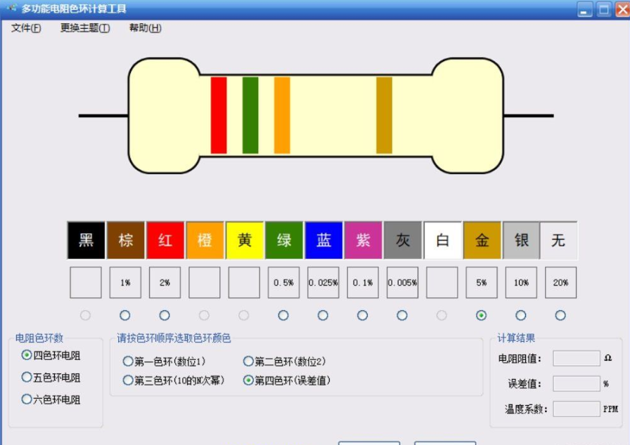 多功能电阻色环计算工具可以帮助计算色环电阻的阻值并给出相应的色环颜色,这种色环电阻常应用于各种电子设备,能够方便维修者读出阻值,便于检测和更换。软件目前支持四道、五道和六道色环的碳膜电阻。