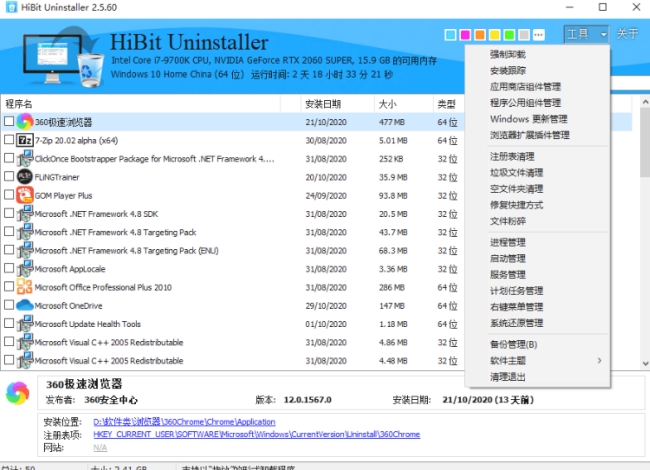 有强制卸载、批量卸载程序、Windows应用商店Appx管理器、Windows更新补丁管理器、浏览器扩展管理器、注册表清理、磁盘垃圾文件清理、快捷方式修复、文件粉碎程序、进程管理器、启动项管理器、系统服务管理器、计划任务管理器、资源管理器菜单项管理器、Windows系统还原管理器等功能。