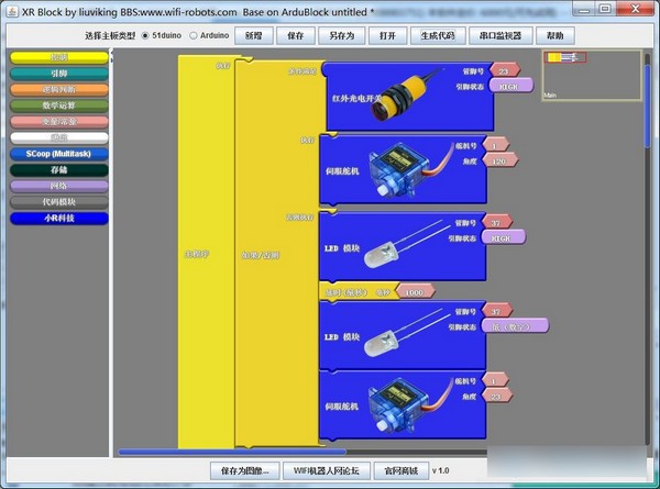 XR Block(图形化机器人编程软件)需要先选择主板类型,它现在支持51duino和Arduino,操作模块包括控制、引脚、逻辑判断、数学运算、变量/常量、通信、scoop、存储、网络以及代码模块等等。