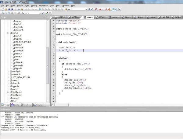 6、如代码无误,编译完成后在51duino_SDK文件夹中找到51duino_SDK.hex,这就是生成的固件,把USB-TTL串口线连接电脑和51duino主控板串口,用STC-ISP软件把固件烧录到51duino主控板,就可以看到效果了