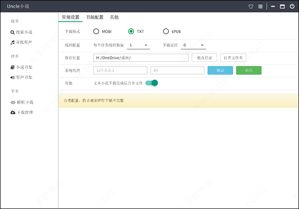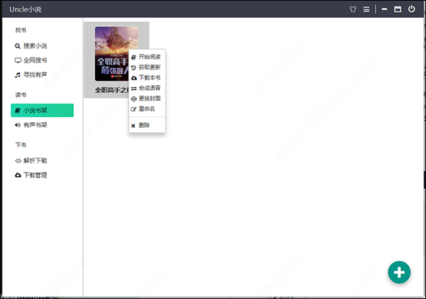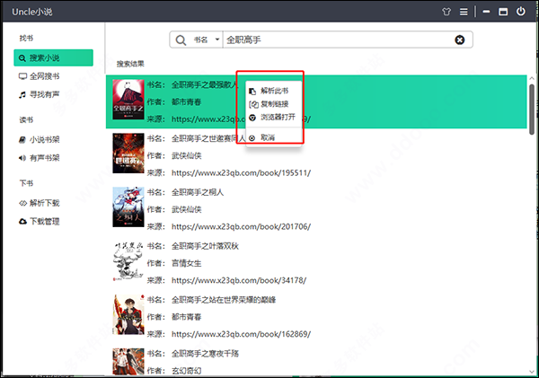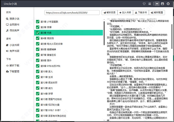 看小说上Uncle小说4,它拥有内置的多个小说源,用户也可以将自己常去的小说网址添加进来,只要输入书名或作者就能快速找到心仪小说,粘贴小说目录地址并解析,可直接在线阅读或下载到本地。阅读时上下章节拼接,还支持使用windows语音引擎朗读。