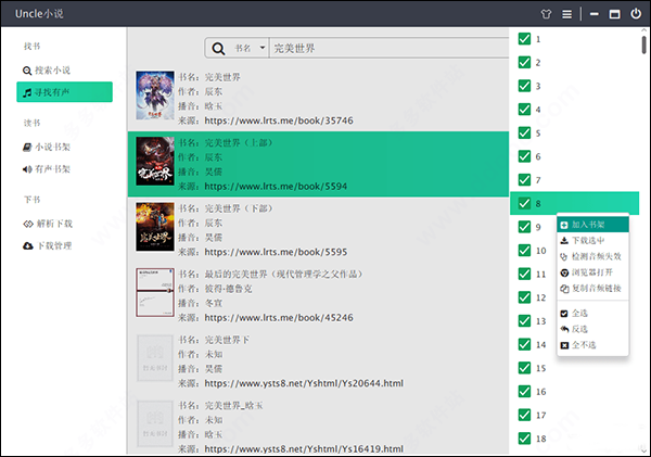 搜索有声小说然后获取到目录,**首先检测音频是否失效** 然后再进行后续操作,加入书架,添加下载。