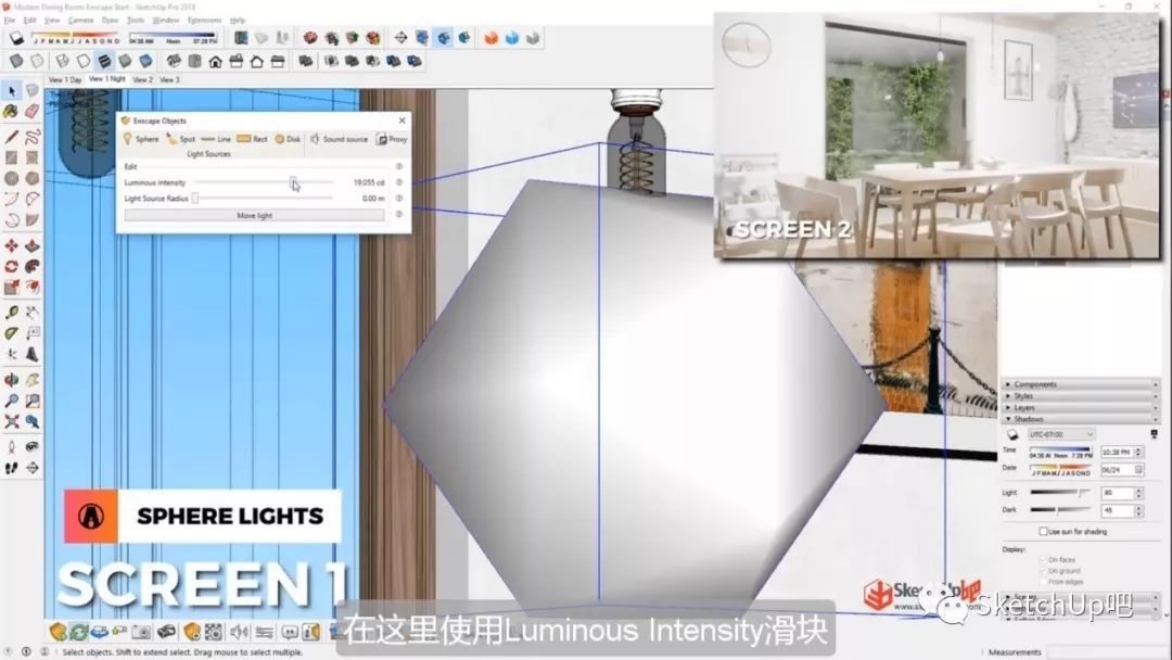 创建后使用LuminousIntensity滑块设定光的强度。(要使光的强度对画面产生影响,我们要去GeneralTab在设置窗口中将自动曝光关闭。当然在这里也可以调整曝光亮度)。