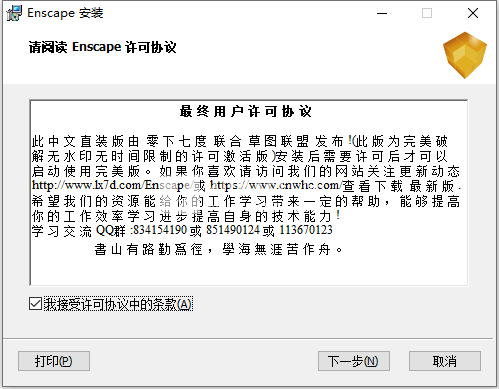 2、双击Enscape-3.0.0-preview.1+32735_zh_中文直装版许可版.msi运行安装,勾选我接受许可证协议中的条款