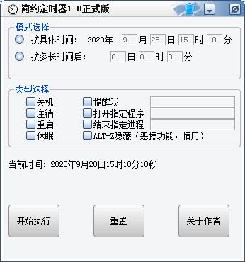 简约定时器的设计是比较简单的,使用的时候可以保留最小化的后台程序,依据用户自己的使用习惯提供了按照具体时间点以及一段时间后设置开关机的机制,类型项中则做了细分,提供开关机、注销睡眠、时间点提醒以及程序进程管理的勾选项,点击开始执行就无需自己再去更改,一旦发现时间不对可立即重置。