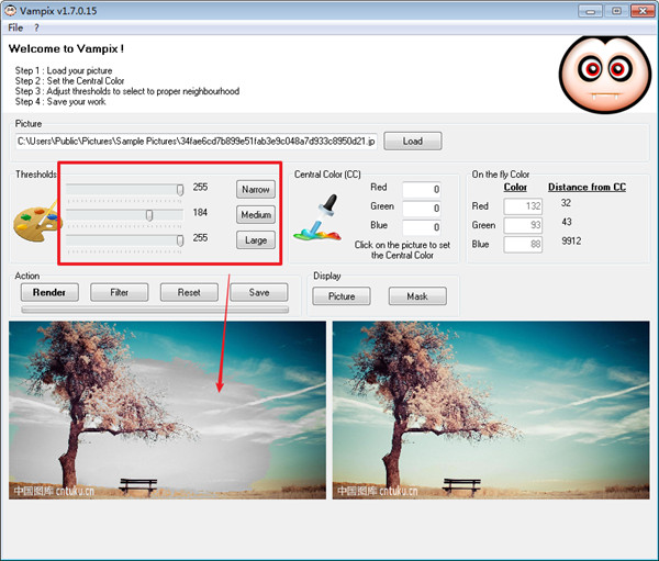 3、所以,你可以从建立一个中心颜色开始,输入红色,绿色和蓝色的颜色值,然后,您可以调整阈值或在小、中和大之间选择一个预设