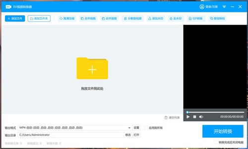 EV视频转换器的界面设计特别简单,而且把所有支持的功能项都设置在了导航栏中,可以对MP4、WMV等一系列常见的视频文件进行互相转换,并且呢能随时查看转换的进度以及实时画面呈现效果,进而完成这些视频的编辑、切割、合并还有增删水印等,对于普通的视频处理需求而言这款工具完全够用。