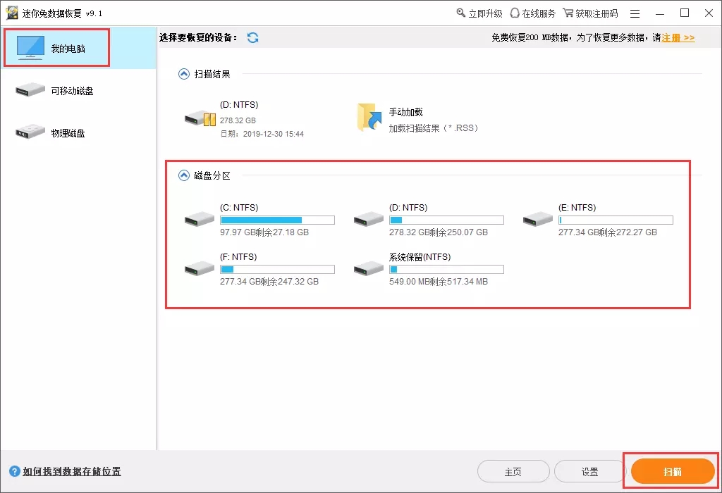 2、进入数据恢复选择界面,这里会显示所有可以进行恢复的分区。比如我们要恢复电脑D盘上的数据,点击左侧【我的电脑】,然后在右侧选中【D盘】,之后点击界面右下方【扫描】。