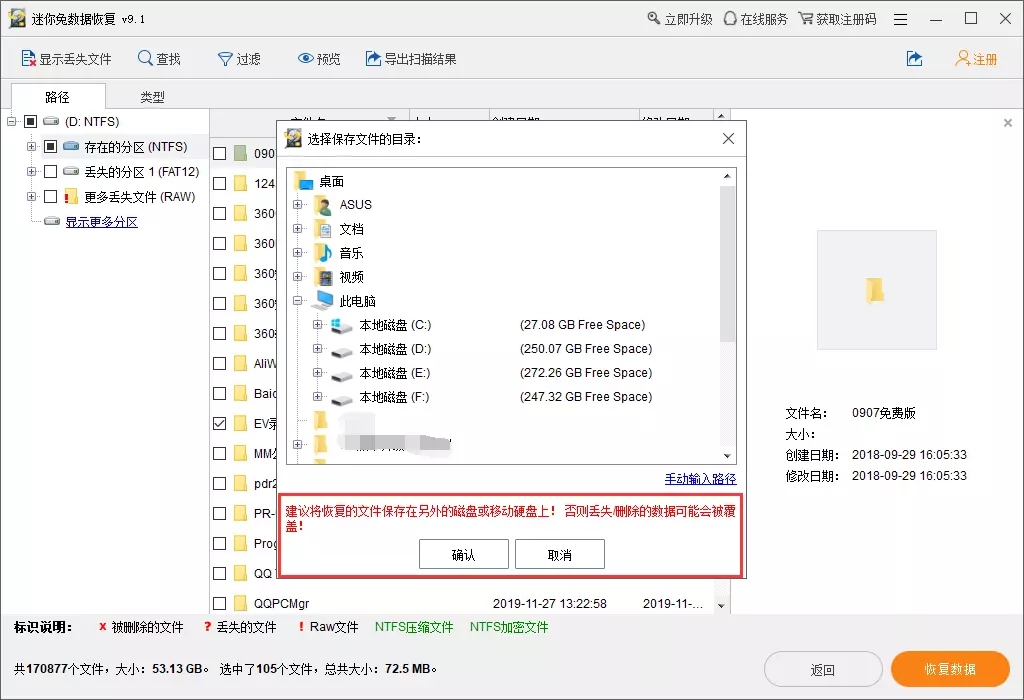 第三步:完全扫描完成后,软件会检测并生成丢失数据的列表,在此列表中勾选需要恢复的数据,并保存在安全路径之中即可。