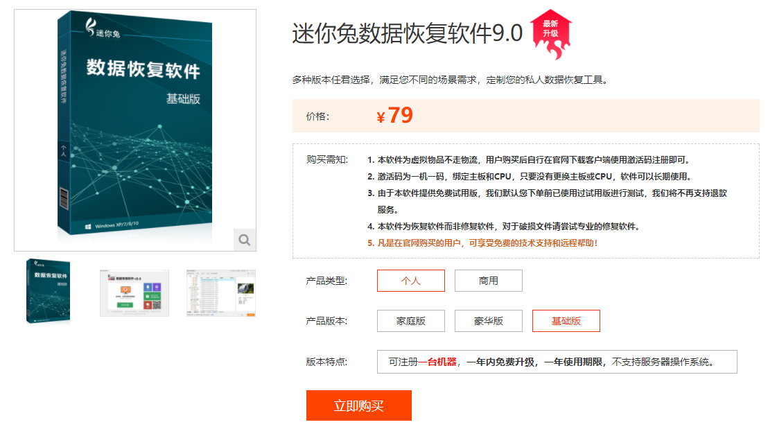 第一步:购买迷你兔数据恢复软件的注册码。您可以根据自身需求,购买对应版本的注册码。购买成功后,注册码自动发货,您可以在邮箱中查看包含注册码的官方邮件。