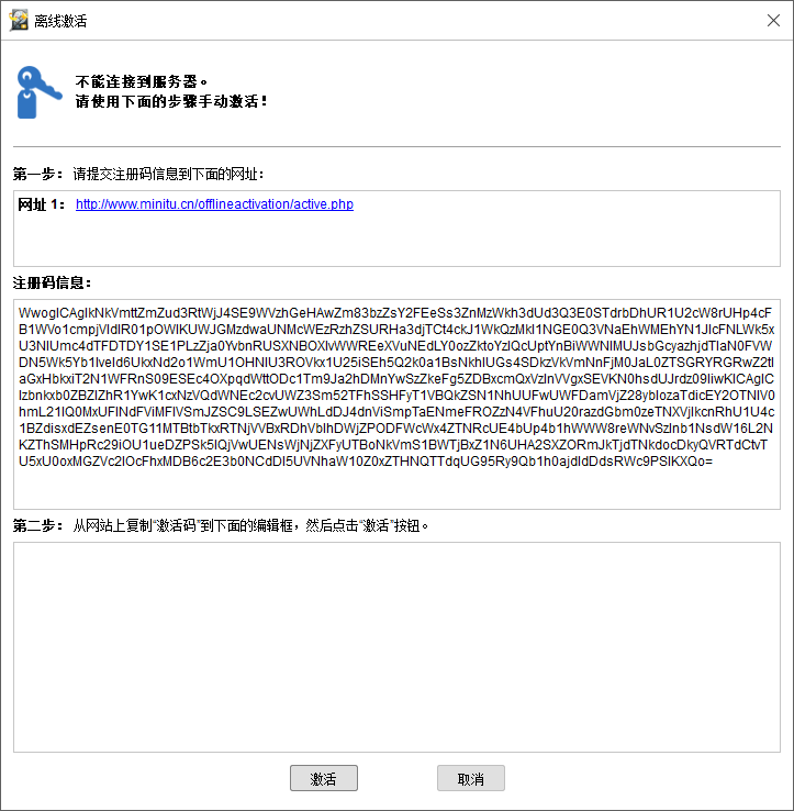 第四步:您可以将上图中的网址和注册码信息,拷贝到U盘或手机等移动设备中,然后在联网的电脑上兑换激活码。