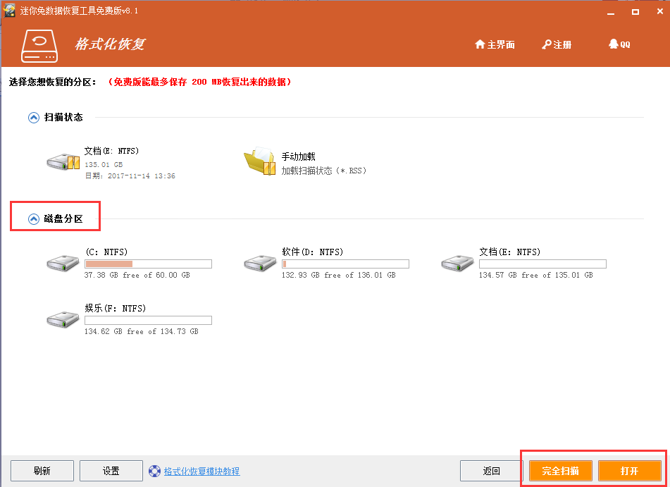 第二步:选择已被格式化的分区或提示需要格式化的分区,点击打开,如果进入后无法找到数据,那么请返回上一步,选择完全扫描。