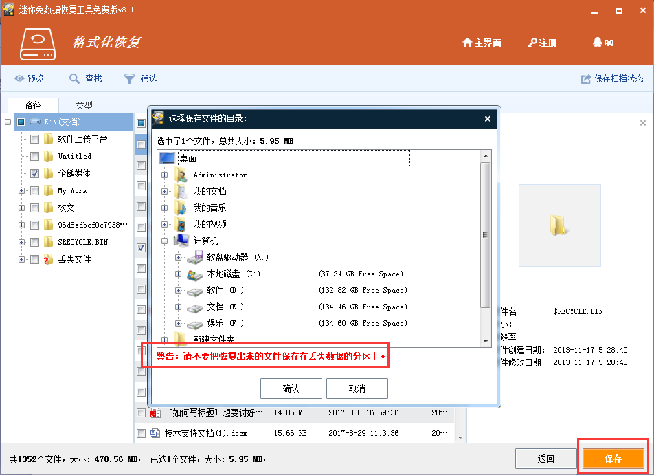 4、这时会弹出恢复文件保存的目录窗口,注意不要保存在文件原来的位置,因为这样会对原来位置的数据进行覆盖,造成二次数据损失;选择保存位置,点击【确定】,文件就会恢复到所需磁盘位置。