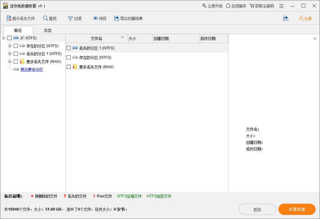 丢失的分区、存在的分区以及更多丢失文件这三个目录下,您都可以挨个查看并查找丢失数据。