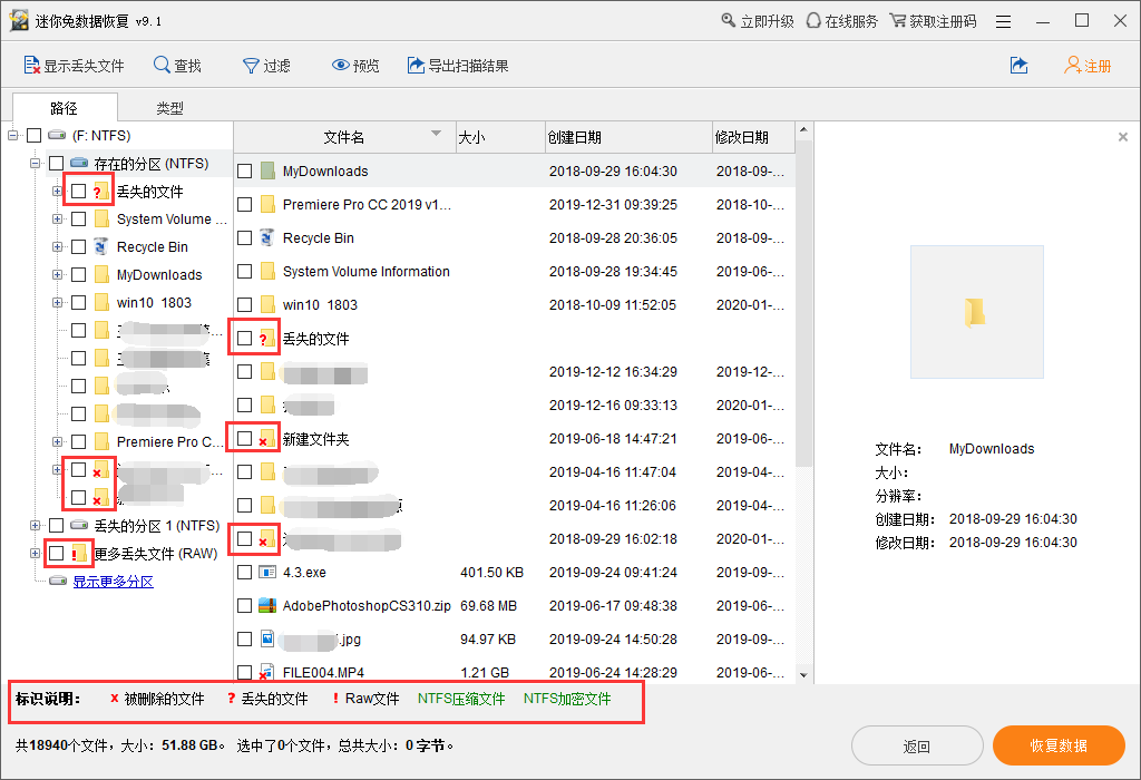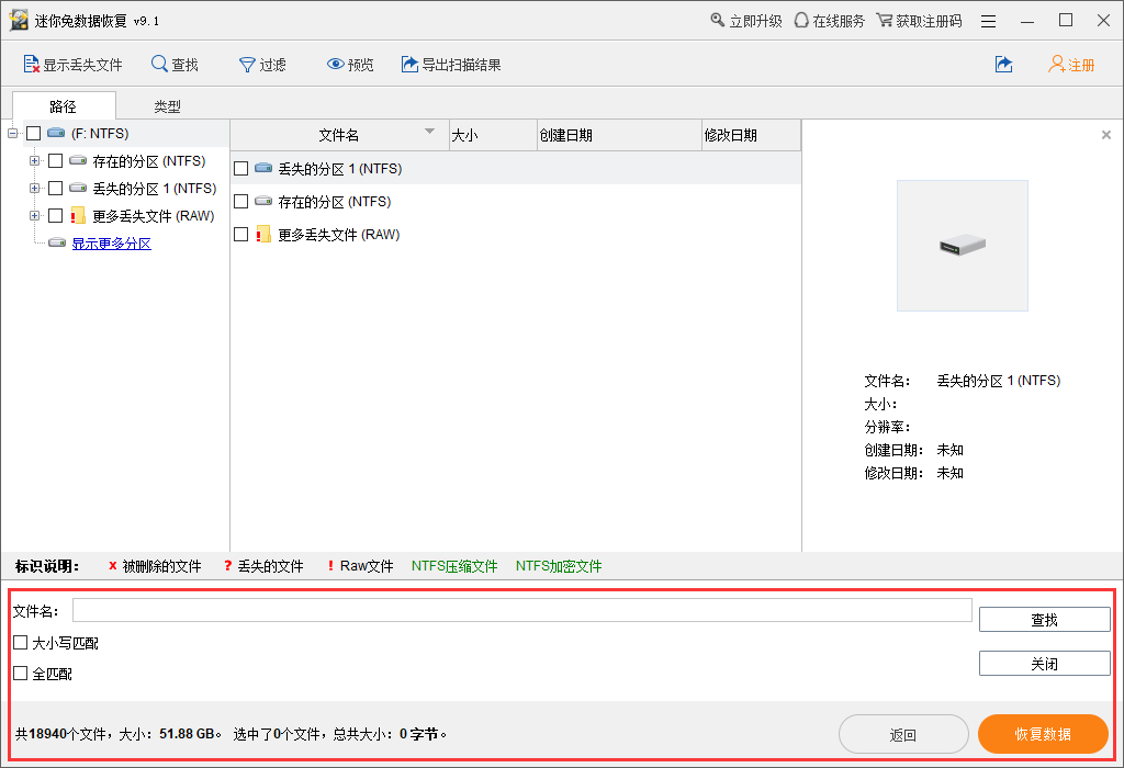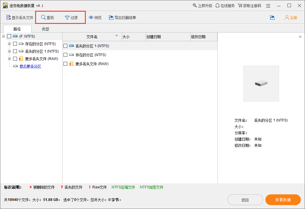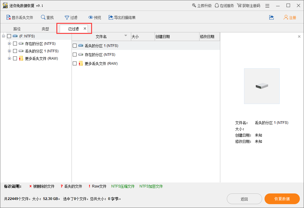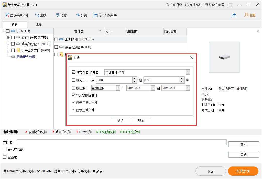 过滤:根据丢失数据的名字、扩展名、大小以及创建时间,精确筛选出符合条件的丢失数据。