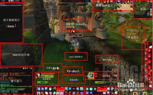 关于界面,没有固定的标准,各人有个人的喜好,主要的目的就是让整个界面协调统一,方便顺手。用我自己的界面作例子,战斗区域(动作条、单位框体、读条监视等)和buff指示都集中在屏幕中间靠下的位置,便于集中注意力。