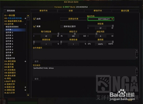 这儿是动作条的总设置,其中蓝色字体的EUI预置动作条样式为大家提供了高分辨率、中分辨率和低分辨率三种预置动作条布局样式。