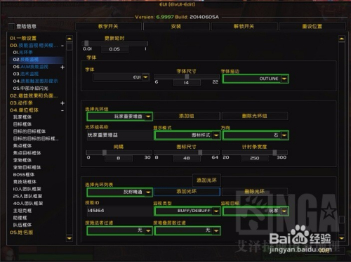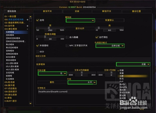 就是玩家和目标的框体、头像、生命值、法力值、职业能量等的设置。打开EUI设置,找到玩家框体作相应设置就好,一般常用的有血量、能量、头像、姓名、施法条、职业条等,因为使用触发监控(下面介绍),光环条我是关闭的。