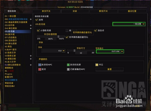 在这儿你可以对全局字体定义进行修改,包括字体的名字和尺寸大小。有些模块如单位框体等有自身的字体设置,不受这儿的影响,颜色定义区用户可以自由定义边框色,背景色,数值颜色和背景透明度。甚至可以调整EUI主要的材质定义,默认集成了超过20种材质供用户选择。