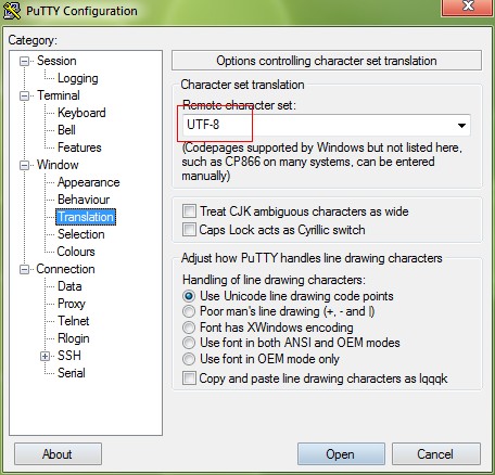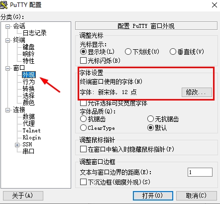 2、打开PuTTY,然后在配置中找到窗口-外观-字体设置。在这里就可以修改字体了。