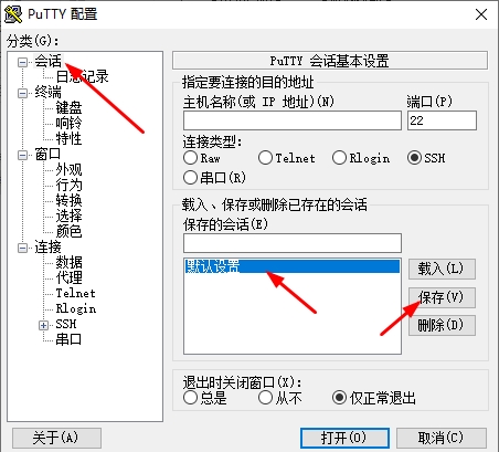 4、最后需要到会话中,选择默认设置,点击保存就可以了。