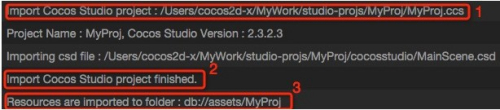 3.导入过程中 Cocos Creator 的控制台窗口会持续输出 log 以显示当前的导入进度效果如下